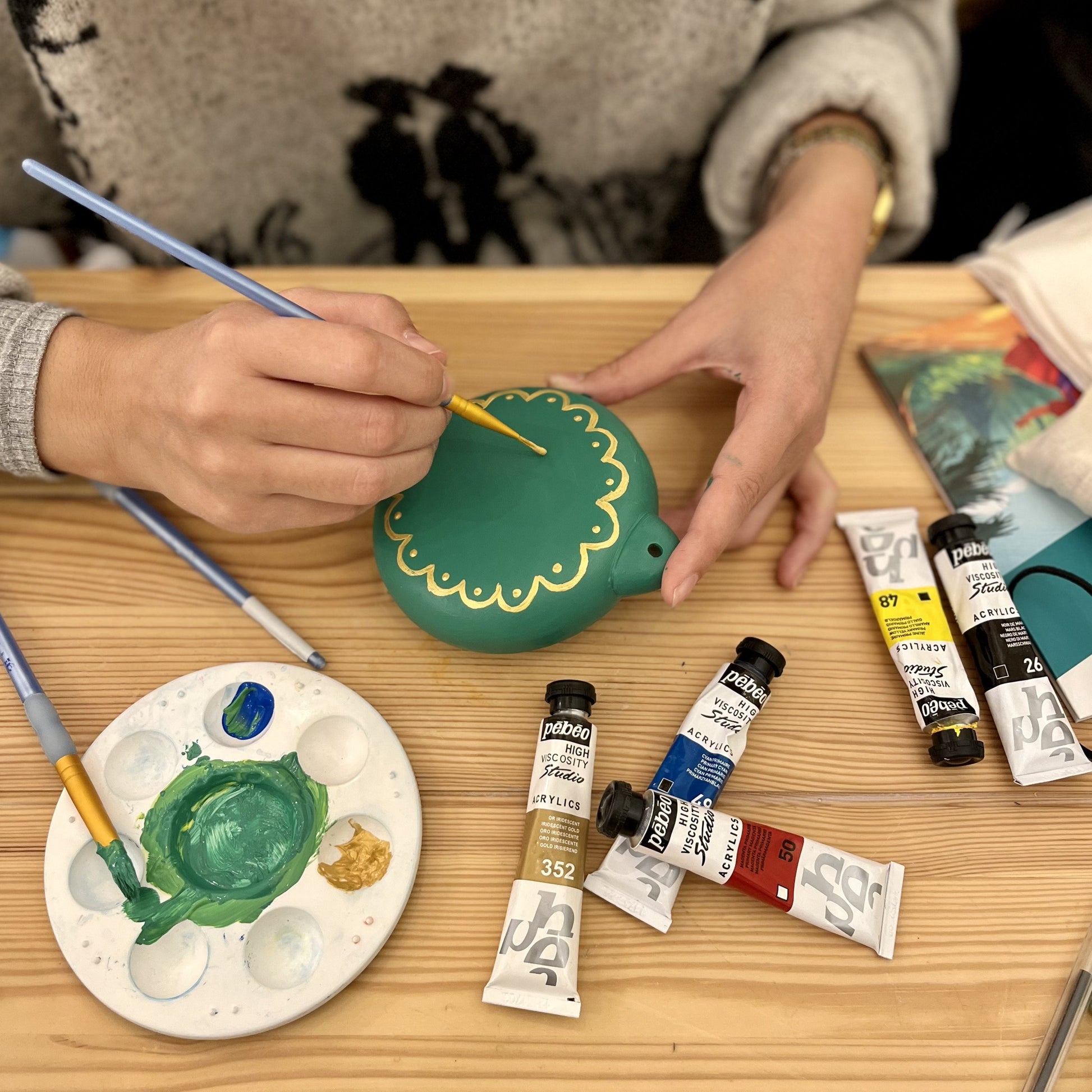 Ce kit n'inclut pas l'émaillage et la cuisson à 1000 degrés de vos céramiques dans notre four de potier. Ce kit inclut de la peinture acrylique, et non de la peinture pour céramique. Vous obtiendrez ainsi des pièces non résistantes à l'eau et non compatibles avec un usage alimentaire, ce qui ne devrait pas être dérangeant pour ces décorations 😊